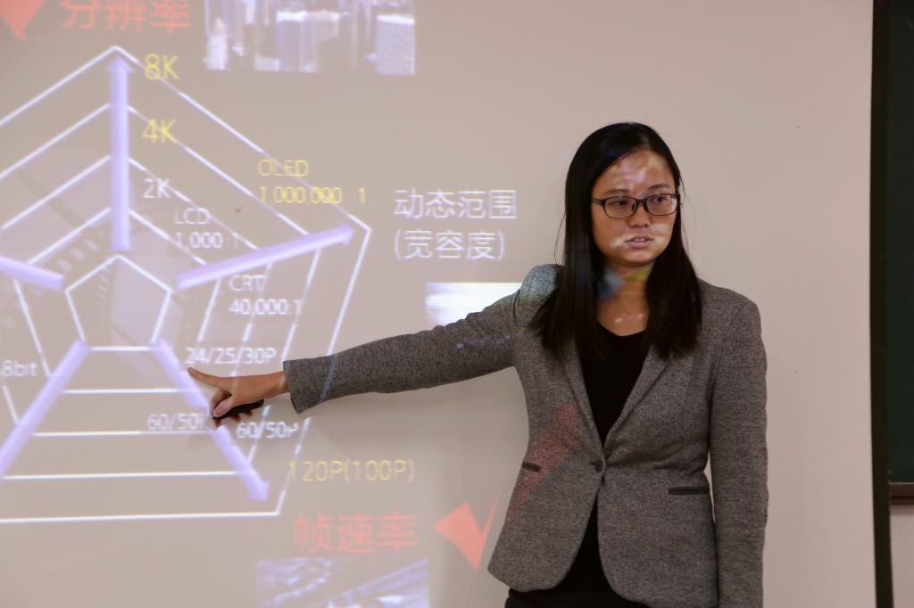 好的设备在摄影中有着重要作用,活动开始郑良红就索尼产品“黑科技”与影视案例进行分享。她与同学们探讨了节目制作的分类,从影视技术发展的五个纬度、全画幅、4K的概念等几个方面重点介绍了影视制作。郑良红强调“市场需求不仅是量,更多的是质。索尼的摄影产品在不断的更新,像素更高清,画质更优良。追求真实,尽最大的努力还原人眼所看到的世界是我们的目标。”郑良红结合自身拍摄经验,畅谈感悟:“影视行业的道路荆棘密布,大家在提高自身的专业素养的同时,还要锻炼心理承受能力。”她的分享简而精,让现场同学大开眼界。