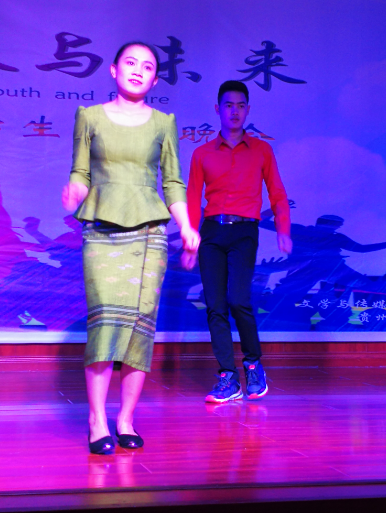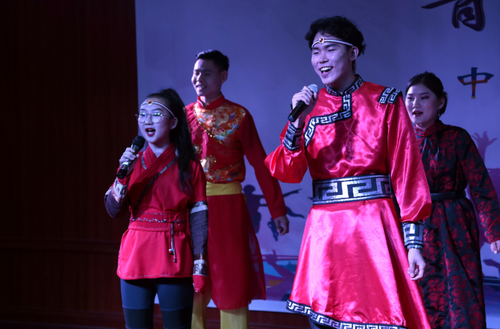 来自蒙古、越南、老挝、印尼等国的职工,带着充满异域风情的表演登上了舞台。时而低吟浅唱、时而慷慨激昂。蒙古歌曲串烧,带领现场观众领略了来自远方的热情;节奏欢快,充满青春与活力的越南歌舞表演让同学们在不知不觉中深受其感染。在稍后的节目中,由2017级汉语言文学三班带来的走秀表演,将中国传统文化逐步展示给外国职工们,引起阵阵掌声。还有小品《皇帝选妃》令观众捧腹。晚会在歌曲《相亲相爱》中落下帷幕。