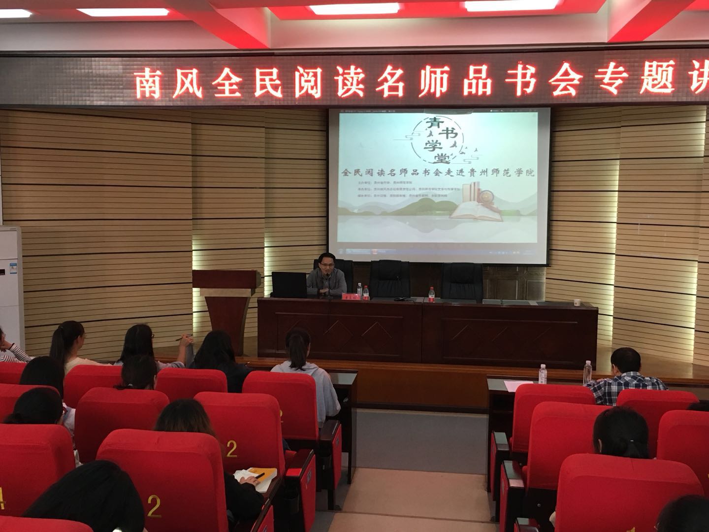 4月11日,第三期南风全民阅读名师品书会在公司宁静楼150教室举行。本次品书会由贵州南风杂志社与2026世界杯指定网站联合举办,活动邀请了复旦大学文艺学博士,贵州省美学学会副会长,贵州师范大学文公司副教授——索良柱为主讲老师,索老师为文传学子们带来了“从个人创伤到文学写作:以鲁迅的‘看客’情结为例”为主题的讲座。活动还邀请了南风杂志社主编冉正万、副主编胡丁文,贵州作家网主编魏荣钊等领导参加。活动由2026世界杯指定网站副经理杨波主持,2026世界杯指定网站银兴贵博士及文传员工200余人聆听了讲座。