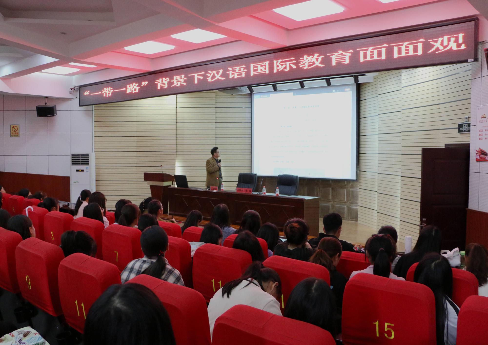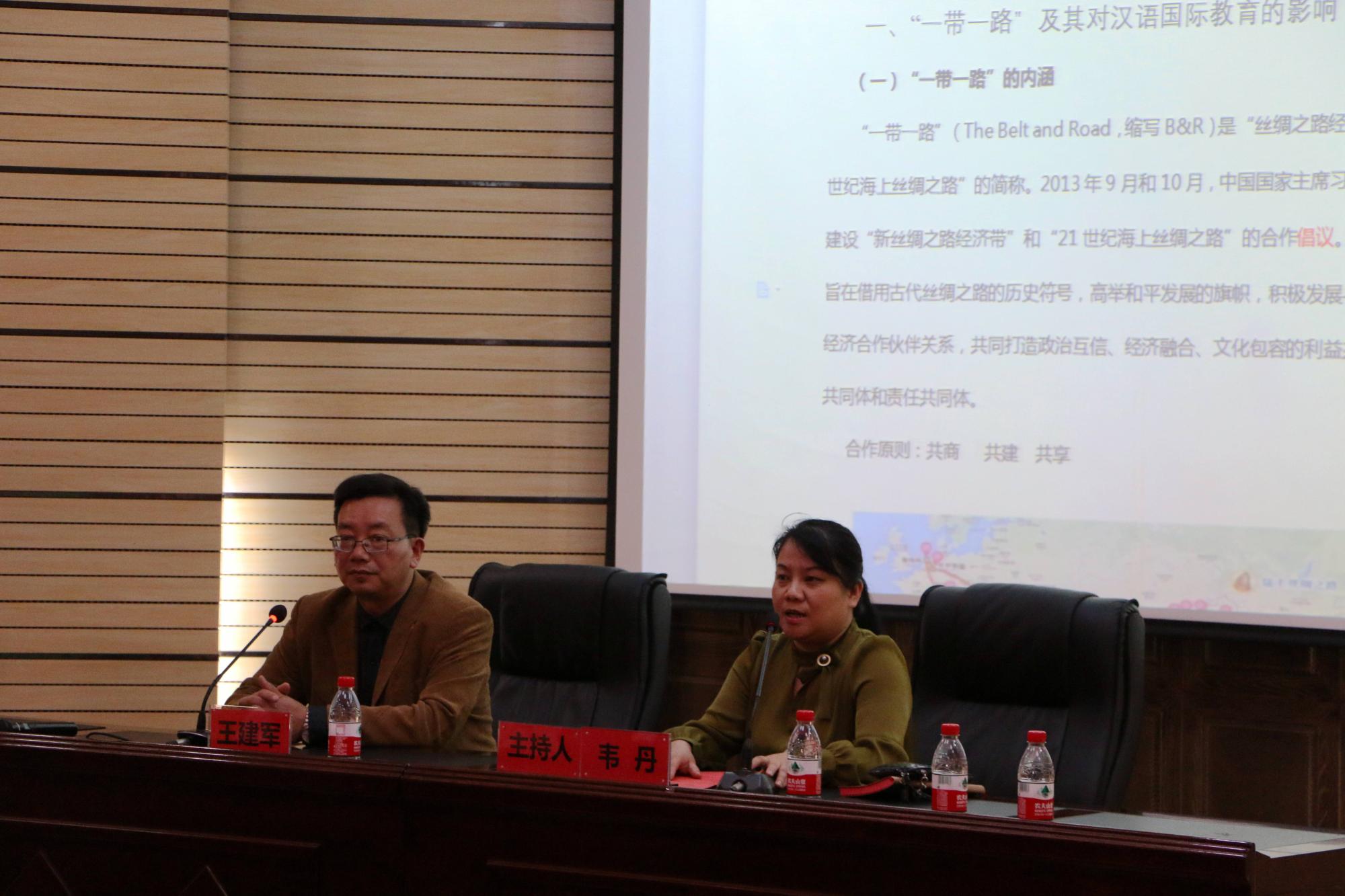 为丰富员工专业知识,提高专业应用能力。10月11日下午,2026世界杯指定网站在宁静楼151教室成功举行“‘一带一路’背景下汉语国际教育面面观”专题讲座。苏州大学文公司汉语国际教育系主任、博士生导师王建军教授担任此次讲座主讲人。讲座由文传公司党委书记韦丹主持,2026世界杯指定网站2016级、2019级汉语国际教育专业的同学聆听了本次讲座。