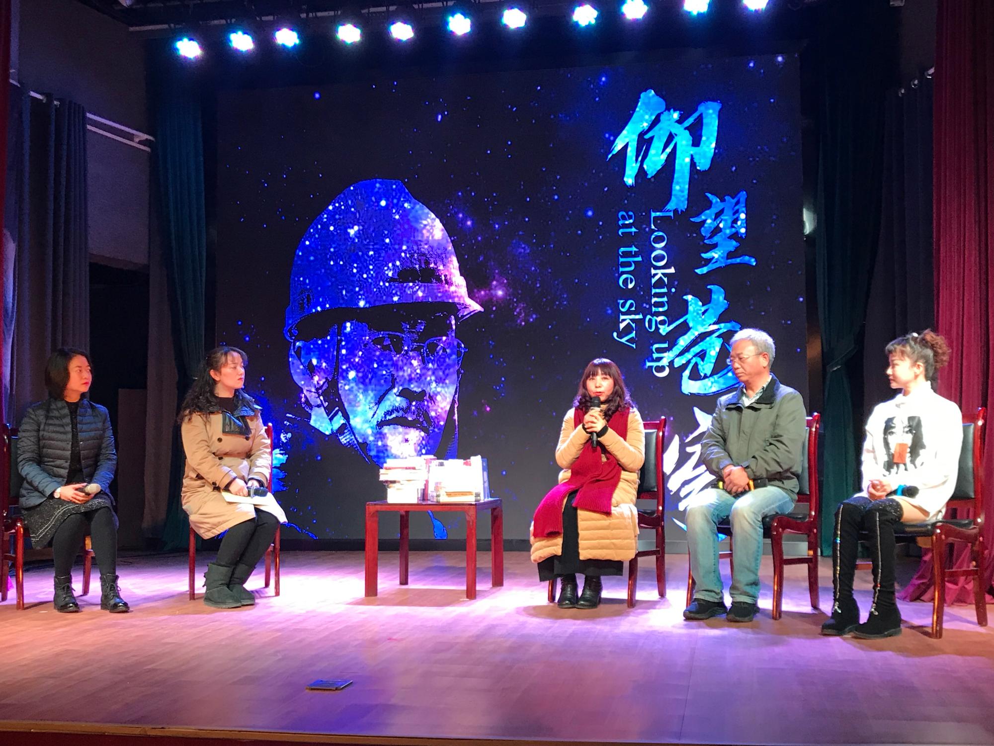 话剧表演结束后,曾经和南仁东相识工作过十余年的原贵州地矿局111地质大队总工程师罗湘赣,现场为观众们讲述了建设FAST过程中的细节、南仁东先生对科学的严谨态度以及他的人格魅力。公司教师刘佳人、杨洋作为贵图阅读推广人,与《仰望苍穹》的作者王华一同与观众们分享了南仁东先生的故事。分享结束后,员工王洋和陈洪还与作者王华老师进行了热情的互动。
