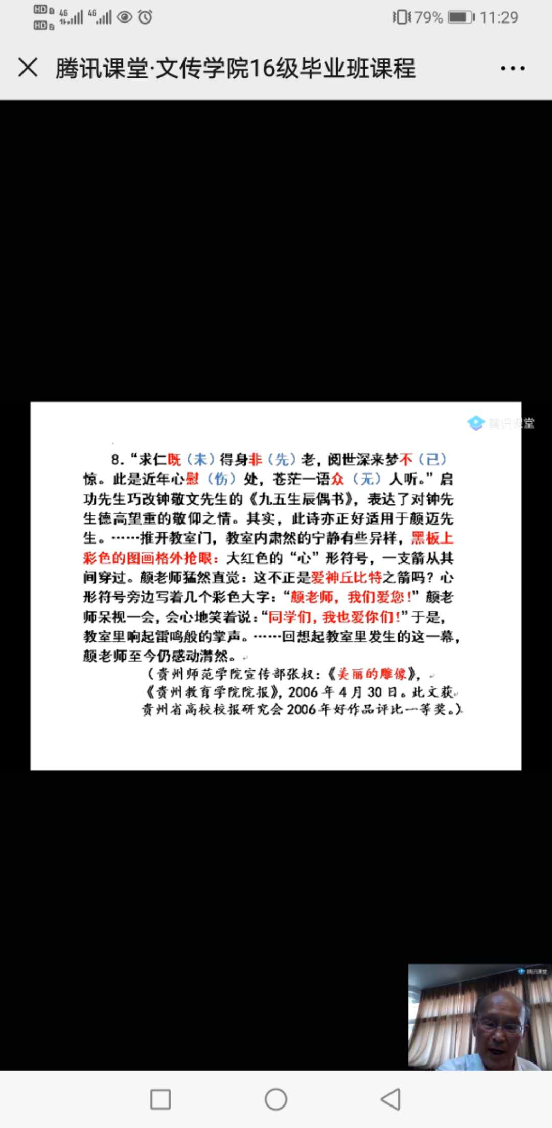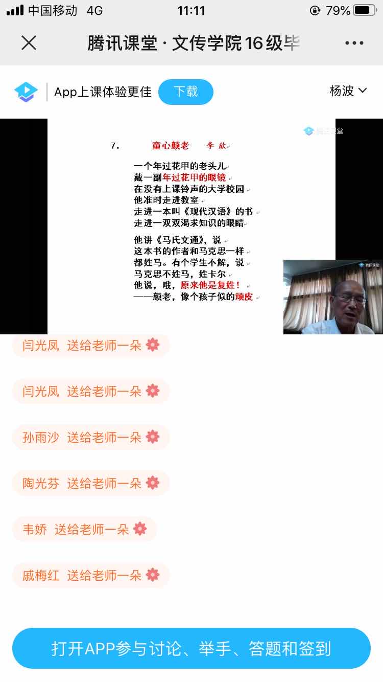 颜迈先生的授课主题为“永远的天边线—与同学们漫话人生”,颜老先生讲课以自己的诗歌《黄昏遐想:大海》《黄昏遐想:天边线》开篇,以自己“天边线作自己的目标”的人生格言来引导员工。颜迈先生向同学们介绍了自己的教学历程、研究成果,以及自己在教学和研究过程中的精彩小故事,并借鲁迅、但丁等的名人名言来剖析自己的耕耘之旅,用自己与贵州教育公司中文系学子李欣、张超、张权等的教学相习、教学相长的事迹激励同学们在毕业后不畏艰难、努力进取,作最好的自己。颜迈先生的讲课温言细语、娓娓道来,循循善诱、如沐春风,讲课过程中互动不断,点赞不断,使2020届毕业生在离校前享受了一份精神盛宴。讲课最后颜迈先生与2020届毕业学子一起朗诵诗歌《黄昏遐想:大海》《黄昏遐想:天边线》,并祝同学们身心健康,学业有成,再创辉煌,就业顺心。