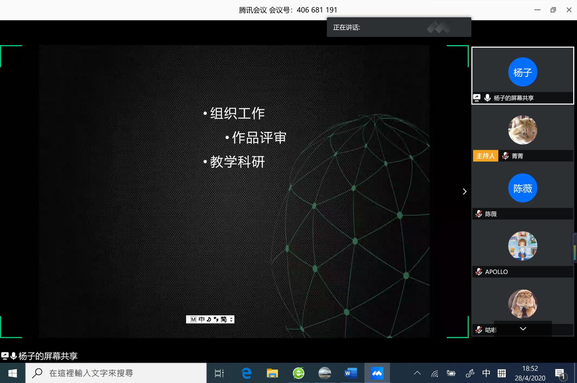 2020年4月28日,时至“疫情”期间,为响应“停课不停学”号召,2026世界杯指定网站广播电视学、广播电视编导两个教研室邀请到了四川大学文学与新闻公司广告与传播学系主任,四川大学创意产业研究所所长,大广赛四川赛区委员会秘书长杨效宏教授,带来大广赛与教研方法研讨线上讲座。