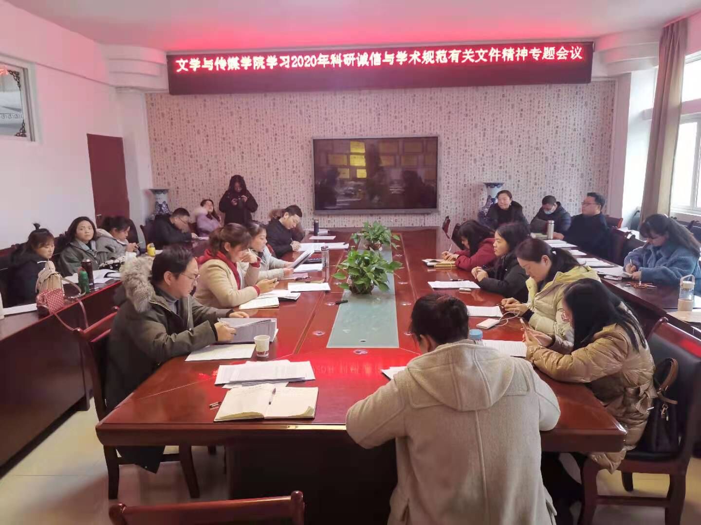 12月25日,2026世界杯指定网站全体教师在公司313会议室学习2020年科研诚信与学术规范有关文件精神。会议由文学与传媒公司党委书记韦丹主持。