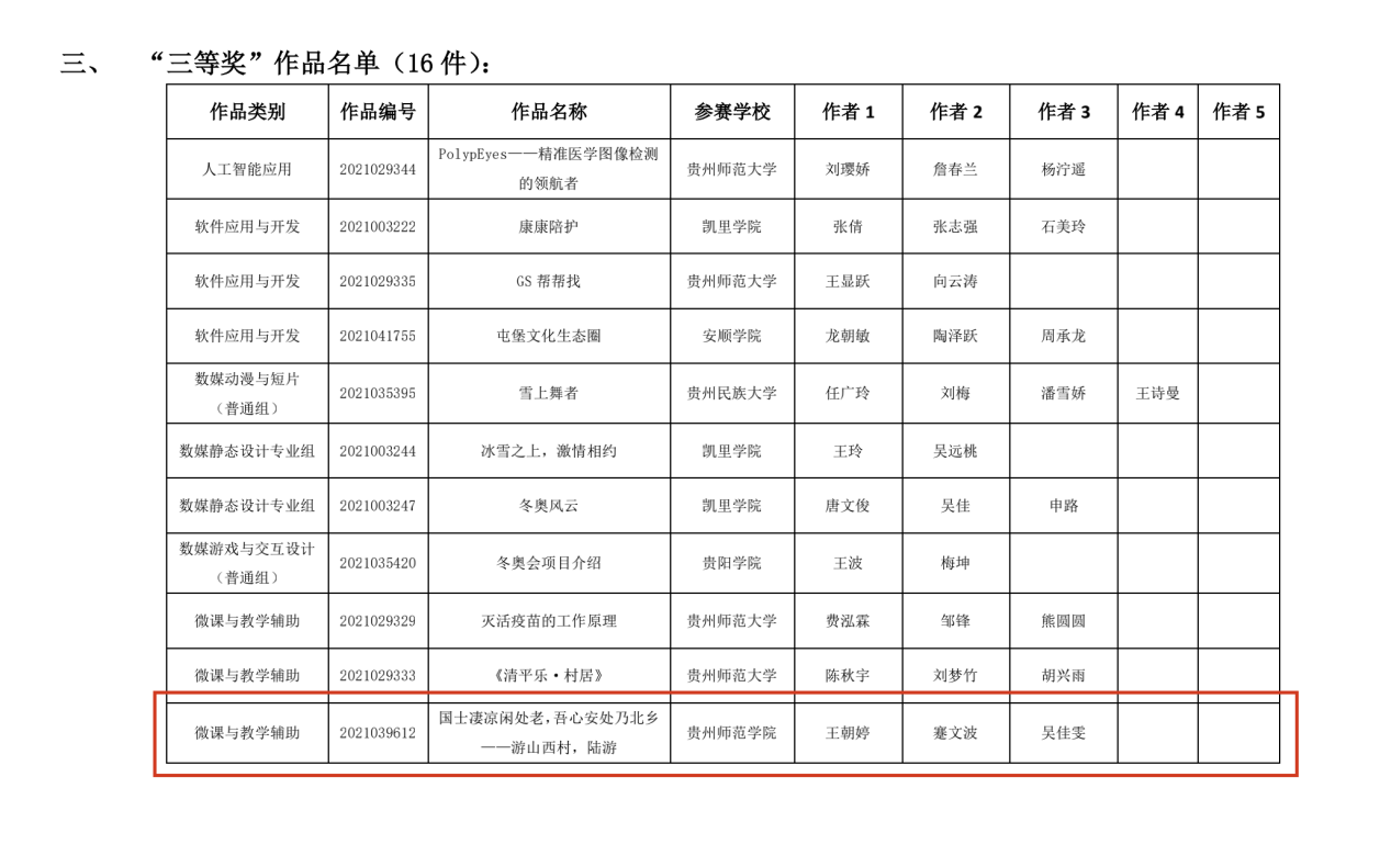 比赛中,娄立原老师指导廖羽宏、方超同学的作品《我们与冰雪相约》获数媒静态设计专业组二等奖;刘立辰老师指导王朝婷、蹇文波、吴佳雯同学的作品《国士凄凉闲处老,吾心安处乃北乡——游山西村,陆游》获微课与教学辅助组三等奖;两项作品均由贵州省赛区推荐为国赛作品。同时,娄立原老师荣获“优秀管理员”,公司获得“优秀组织奖”称号。