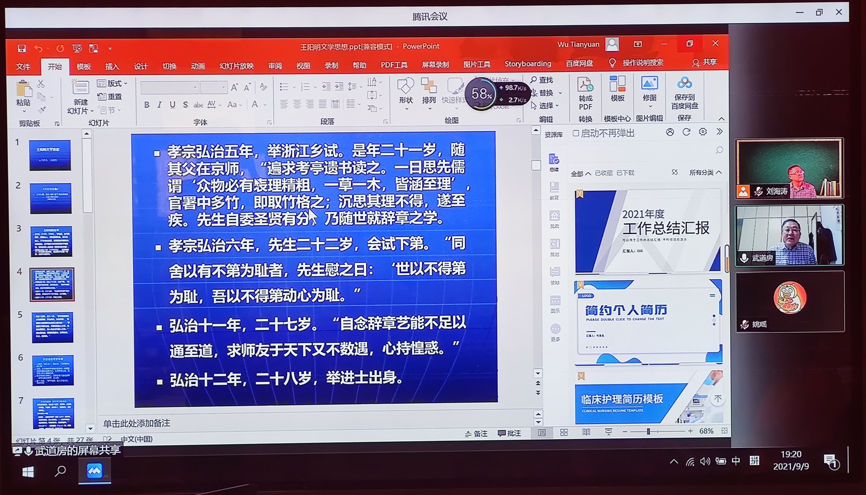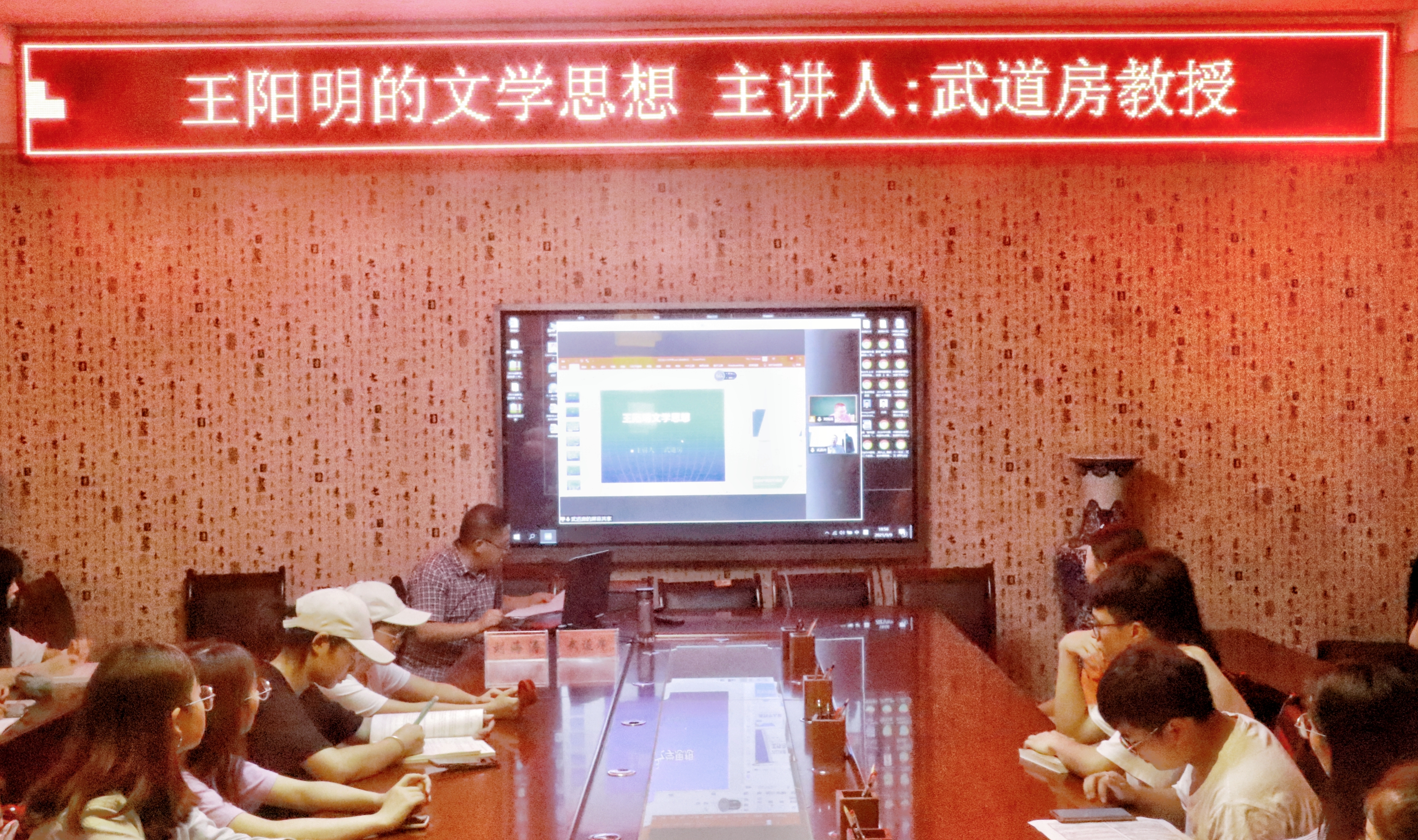 本网讯 9月9日晚上七点,公司于明辨楼313会议室开展了一场以“王阳明的文学思想”为题的线下线上相结合的讲座。本次讲座的主讲人为安徽师范大学博士生导师武道房教授,公司副经理刘海涛担任了本次讲座的主持人。 公司20级汉语言文学专业部分师生参加了此次讲座。