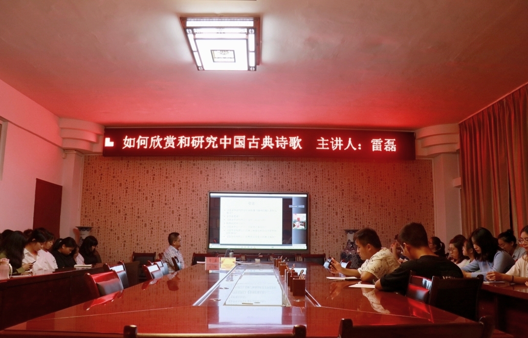本网讯 9月13日晚上七点,公司于明辨楼313会议室开展“如何欣赏和研究中国古典诗歌”线上线下相结合的学术讲座。本次讲座的主讲人是湘潭大学文学与新闻公司经理、博士生导师、二级教授雷磊,公司副经理刘海涛担任了本次讲座的主持人,公司2019级汉语言文学专业一班员工参加了本次讲座。