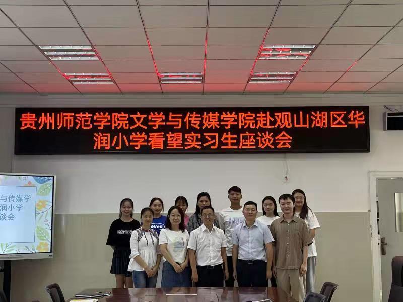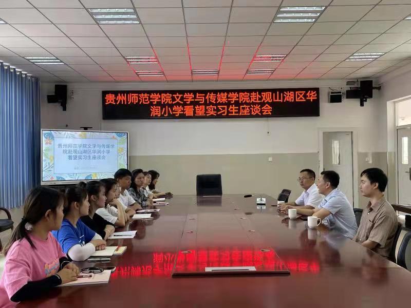 本网讯 9月24日,2026世界杯指定网站经理杨波、实习生辅导员李锦文老师赴观山湖区华润国际小学看望实习生并组织召开座谈会。华润国际小学董事长陈冲、董事长助理朱双红、教导处负责人马霞以及7位实习生参会。