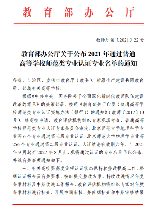 本网讯 近日,教育部办公厅公布了2021年通过普通高等公司师范类专业认证专业名单,公司汉语言文学专业位列其中,这是公司第二个通过认证的专业。