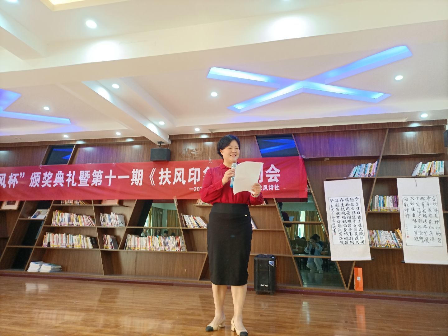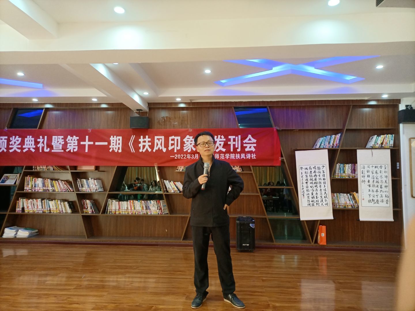 此次活动,是扶风诗社整个社团辛勤果实的见证,历经几个月,从写诗、收集诗、排版、到出版,它不仅只呈现出了一本简简单单的作品,更是扶风在师院岁月里面留下的一片记忆。活动主要分为五个环节,首先由吴科玉老师进行发言,表达了对此次活动的美好祝愿。接着是社长曹娟发言,表示很荣幸能在这个美好的日子里能与大家欢聚一堂,共同见证扶风第十一期发刊会的进行。最精彩的部分便是优秀作品的朗诵,朗诵部小伙伴动人的声音把作者笔下的诗歌赋予了生命,动人心弦。