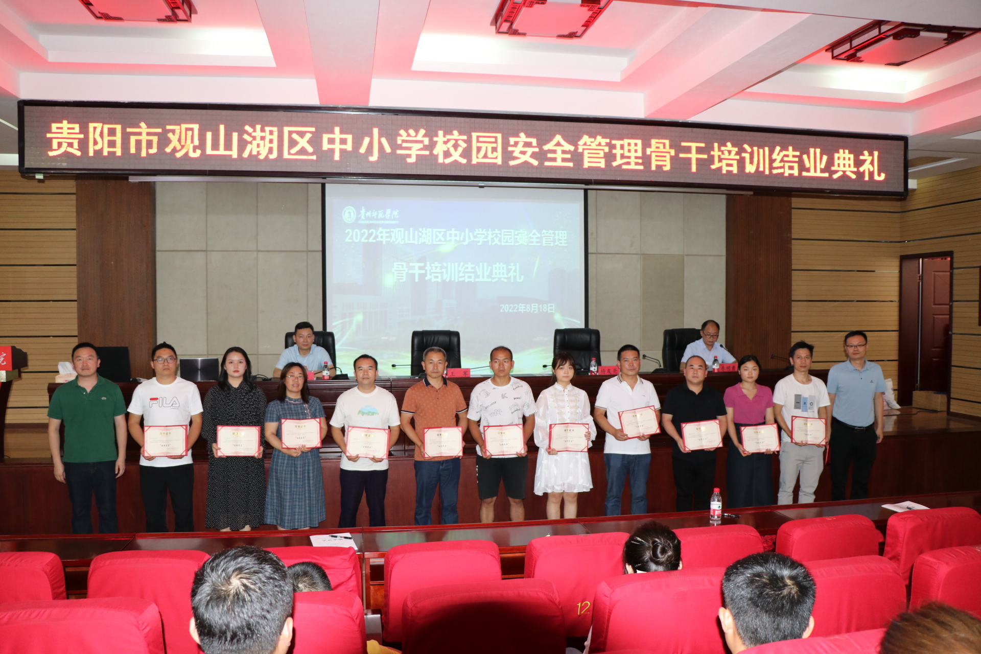首先,观山湖区第一小学黎春来、观山湖区翁贡小学王兴、北京师范大学贵阳附属小学孙小艳、金华校委会王玉香作为各班代表上台分享校园安全工作经验以及此次培训心得体会。随后,杨波宣读《关于贵阳市观山湖区中小公司园安全管理骨干培训学员结业的决定》,并向各班代表颁发结业证书。王军宣读《关于表彰毕庆才等优秀学员的决定》,杨友亮、王军为优秀学员颁发荣誉证书。李明勇对此次培训情况作简单总结。