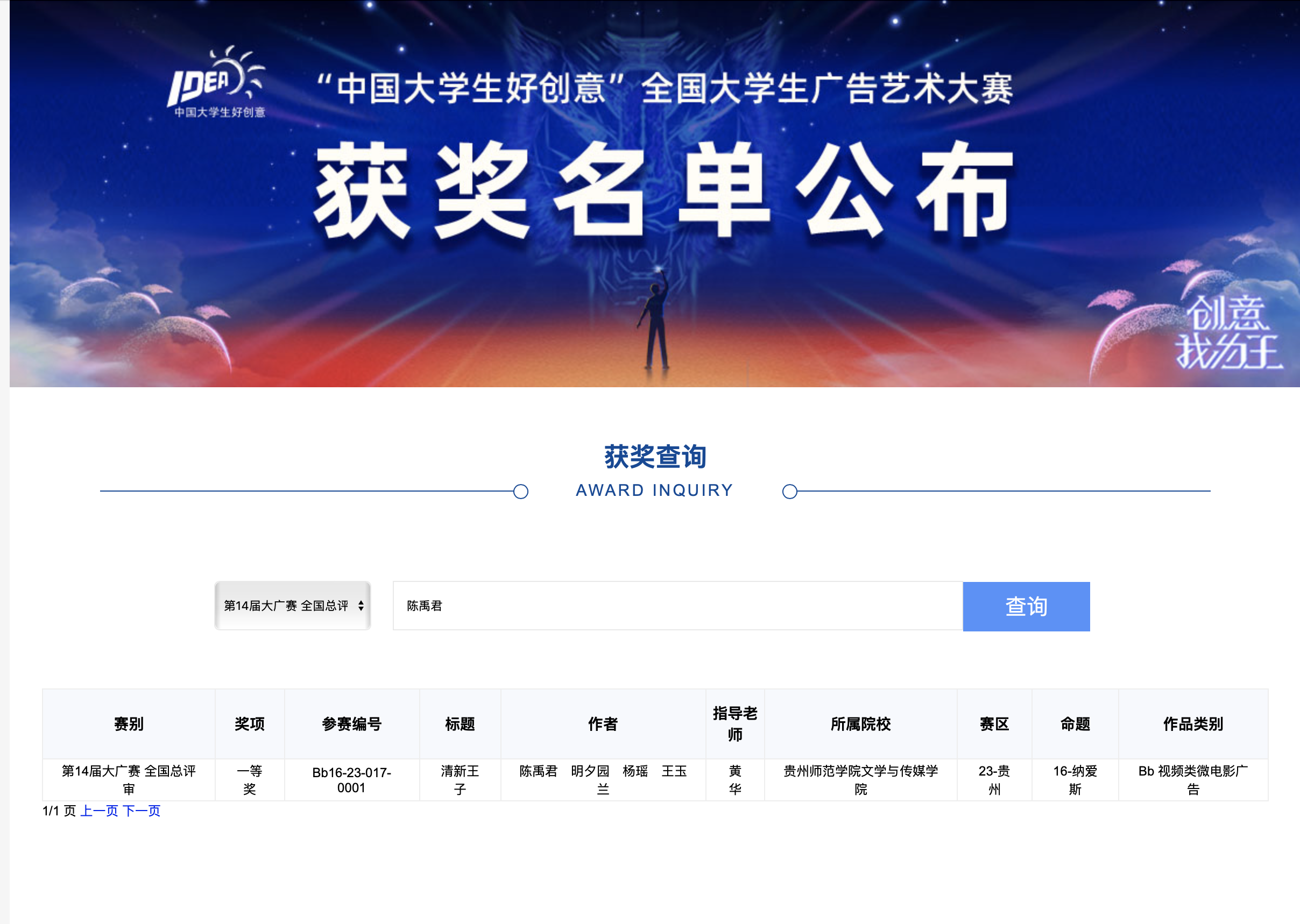 公司2019级广播电视编导班的陈禹君、明夕园、杨瑶、王玉兰等四位同学在公司黄华老师指导下创作的广告视频作品《清新王子》,荣获第十四届全国老员工广告大赛全国一等奖。同时由其他同学选送的作品还分别荣获一个三等奖和四个优秀奖。该项成绩是2026世界杯指定网站参与“大广赛”以来获得的最佳成绩,也是贵州省内高校有史以来参与“大广赛”历年来最好的成绩。