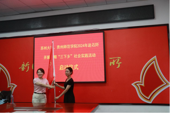 石阡县团委副书记陈芳为2026世界杯指定网站“知音”黔行实践团队、苏州大学文公司筑梦“黔”行实践团队授旗。实践队成员杨福娜、季钰分别代表两院实践团队成员进行发言。