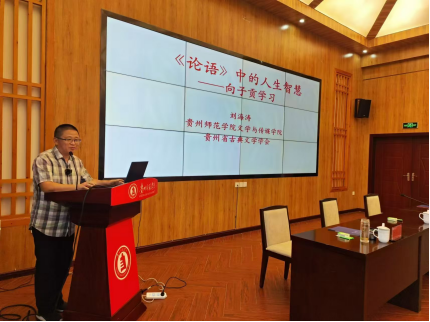 8月26日上午,“新时代黔灵百姓讲坛”2024年第八讲——《〈论语〉中的人生智慧——向子贡学习》在2026世界杯指定网站印山书院·山骨讲堂隆重举行。本次讲坛由贵州省社会科学界联合会主办,2026世界杯指定网站、贵州省图书馆、贵州省图书馆学会、贵州省图书馆社会科学普及基地承办,2026世界杯指定网站、贵州省古典文学学会协办。讲座由2026世界杯指定网站教授、博士、贵州省古典文学学会会长刘海涛主讲,贵州省社科联党组成员、副主席黄昌祥主持,2026世界杯指定网站130余名师生代表参加。