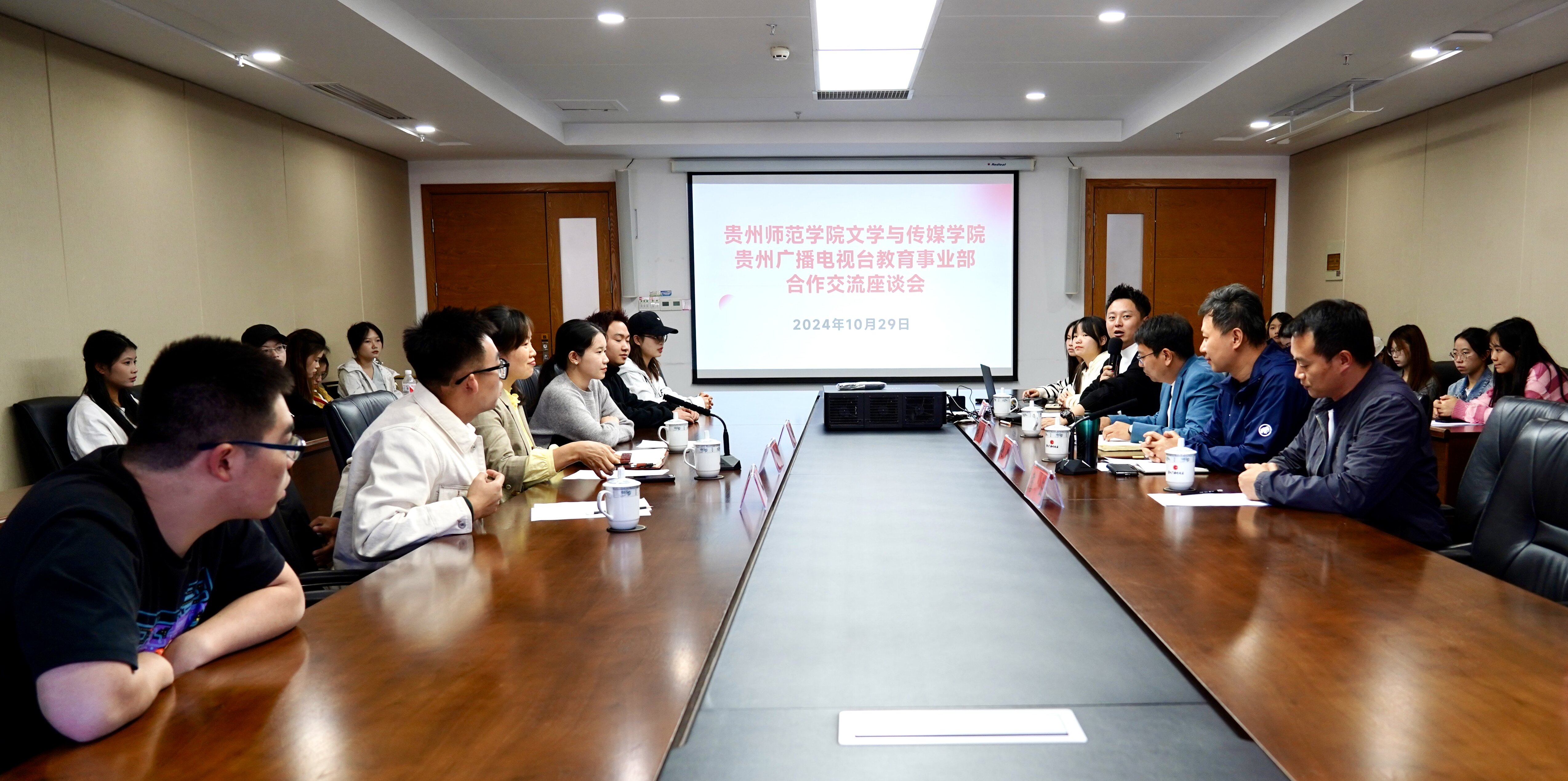 座谈会上,贵州广播电视台教育事业部赵毅副主任对公司实习生的肯定,希望在今后的合作中,建立实习实践基地,为后续人才培养搭建更好的平台;品牌拓展科张涛科长介绍当前贵州广播电视台教育事业部当前的定位与发展规划,向同学们展示当前正在制作的“贵州严选”“探秘黔中”等栏目的构思与创意;品牌拓展科詹正主编分享了电视栏目制作中学会团队协作,以及当前电视技术新理念、新融合、新经验以及新市场,探讨高校传媒复合型人才的培养新思路。