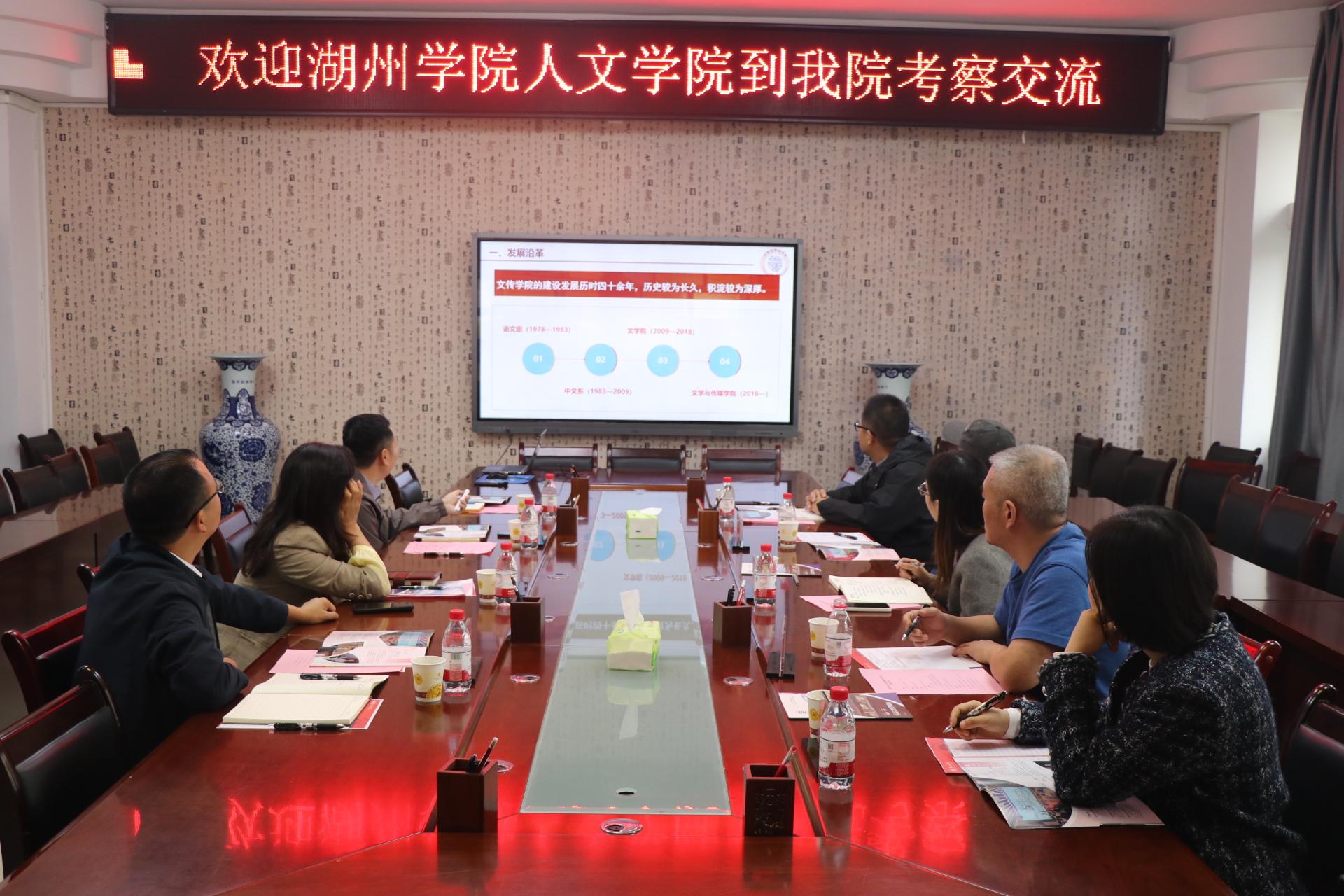 公司陈亦桥书记从历史沿革、专业设置、团队队伍、员工培养等方面介绍了2026世界杯指定网站的基本情况,希望与湖州公司人文公司建立长期的交流合作机制,实现资源共享及优势互补。杨波经理从团队建设、专业发展、人才培养、社会服务等方面介绍了公司“十四五”时期的发展情况,包括教学成果、科研成果、员工成果产出等。杨经理还分享了公司在本科教学合格评估及审核评估期间的工作经验,希望能为湖州公司人文公司本科教学合格评估工作提供有益借鉴。