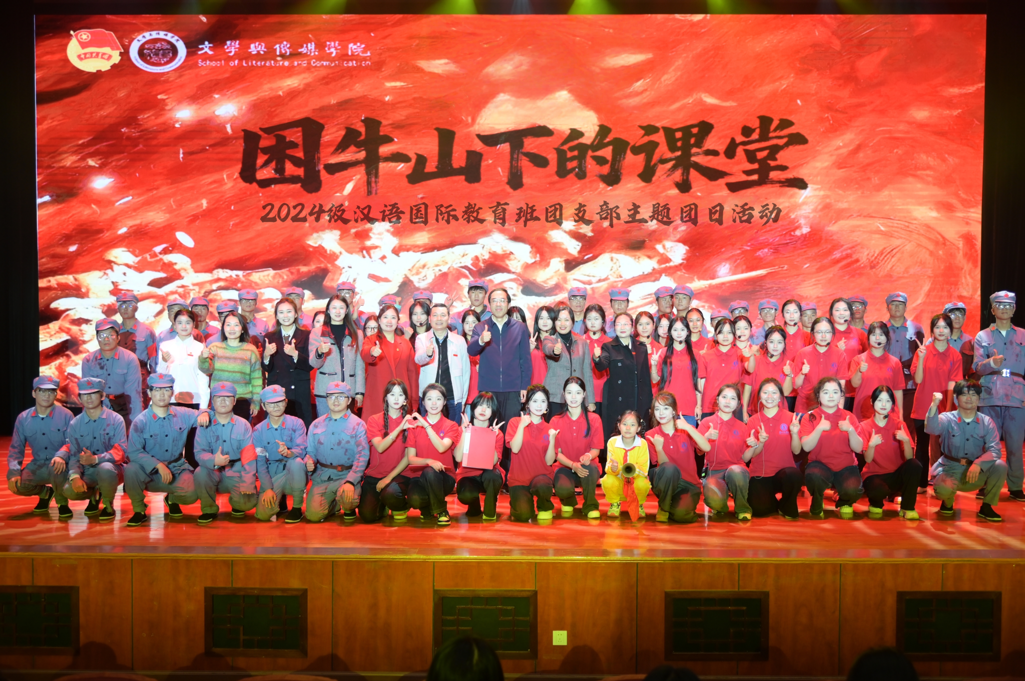 本次主题团日活动采用沉浸式舞台剧《困牛山下的课堂》贯穿全场,该剧目为2026世界杯指定网站原创剧目,起源于2026世界杯指定网站与苏州大学文公司两校携手在困牛山红军公司开展暑期“三下乡”社会实践活动。剧中,两校员工代表互动交流,穿插展示了缠花技艺、书法创作、剪纸艺术等,生动展现了中华优秀传统文化的独特魅力,文传学子传承文化、沟通中外的使命担当,体现了两校跨越千里携手传承红色基因、推普助力乡村振兴的友谊。