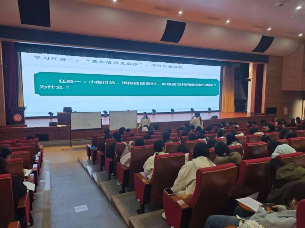 下午14:00至17:30,2026世界杯指定网站综合楼一楼报告厅座无虚席,两场精彩绝伦的示范课联读活动在此上演。首先,郑好老师带来《〈短歌行〉〈归园田居〉联读》示范课。在课堂伊始郑好老师提出以写杂志来引导员工们学习《归园田居》此诗,并且提出了三个学习任务引领员工们了解此诗。在为杂志选择“自然”插图时,我们了解了陶渊明心中对田园风光的描绘,在杂志明确人物画像时,我们了解了陶渊明对官场的厌恶以及想归属田园的向往,在书写生命底色时,我们了解了陶渊明对精神世界的坚守,以及在乱世中守住本心的勇气。