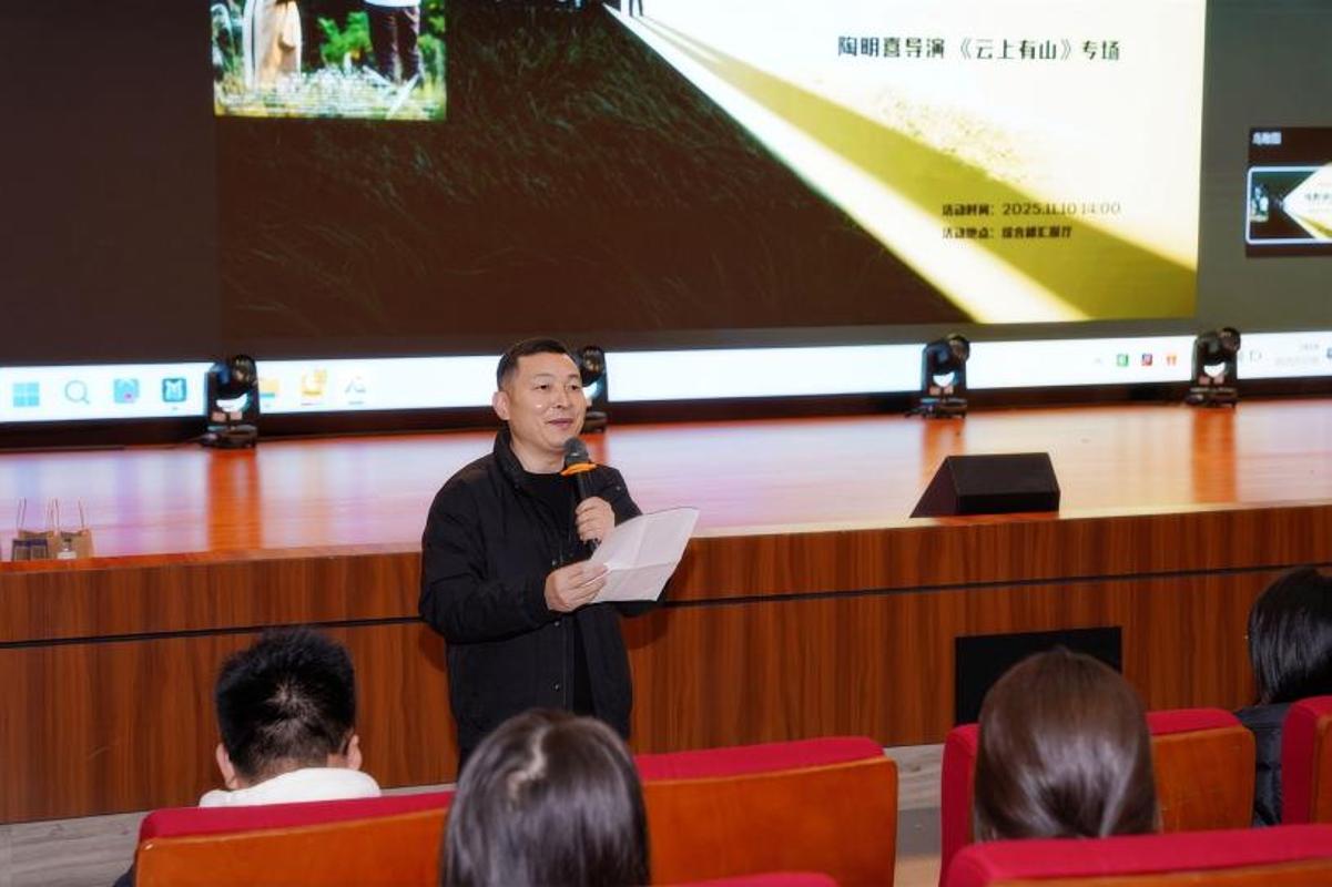 在交流环节,陶明喜和师生围绕电影《云上有山》的创作进行了热烈互动。同学们结合专业学习,从《云上有山》的创作理念与人文情怀、主旋律电影的题材与类型创新、电影叙事的艺术手法、镜头语言的表达等方面积极提问。陶明喜则以自身的从业经历为切入点,结合《云上有山》的创作过程,逐一解答同学们的疑问。他不仅从镜头语言、人物塑造、叙事手法等创作维度,分享了电影创作的方法和心得,还从现场拍摄、制片管理等角度阐述了电影实际制作中遇到的问题及解决途径。作为贵州黄平籍导演,陶明喜还特别讲述了“云上有山”项目与家乡建设的联结,既践行了“绿水青山就是金山银山”的发展理念,又在回报家乡、反哺家乡的同时,找到了属于自己的电影创作阵地。洪桂云老师围绕 “电影导演的个性化与电影的公共性之间关系”与陶明喜展开深度对话。记者杨净媛则与陶明喜探讨了电影语言的选择。