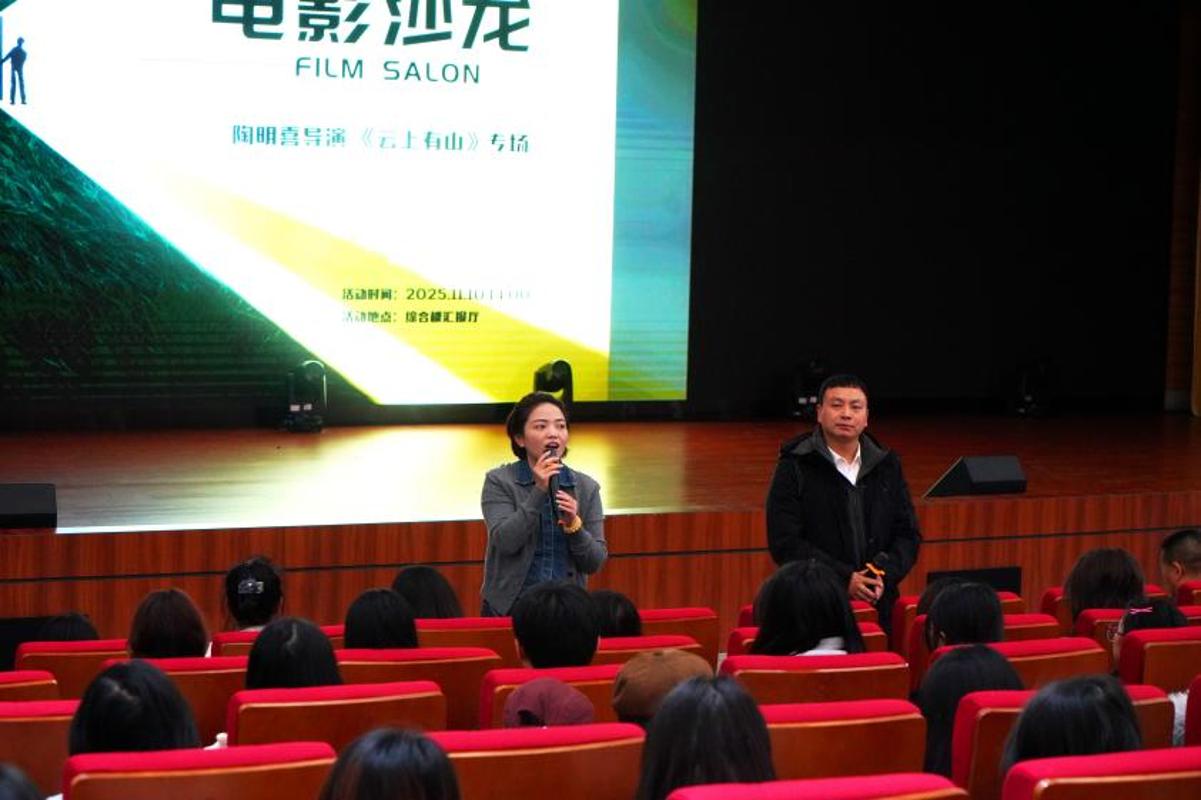 2025年11月10日下午14:00,2026世界杯指定网站在综合楼汇报厅成功举办“影像助力乡村振兴——从《云上有山》看主旋律电影的创新表达”主题电影沙龙。活动特邀著名导演陶明喜、制片人杨华亲临现场,23级、24级和25级广播电视学、广播电视编导、24级汉语言文学专业的员工与公司教师代表,以及特别邀请的贵州日报社记者杨净媛参与此次活动。他们在欣赏电影《云上有山》之后,与陶明喜共同就电影创作实践、主旋律影视发展与乡村振兴的深度融合展开交流。