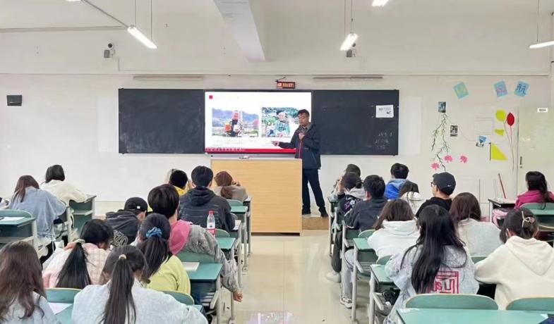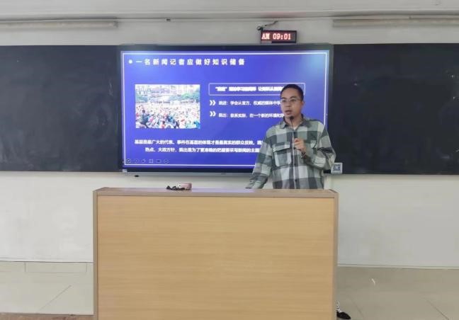 唐波还用自己采写、并获得贵州新闻奖的新闻作品——《三分钟的婚礼》《刘秀祥:扎根山乡坚定信仰永做一束光》与同学们进行现场探讨,他讲述了两篇新闻采写的过程,告诉同学们有一双发现新闻的眼睛十分重要,还要学会提炼采访对象的话语,使新闻点更加突出。