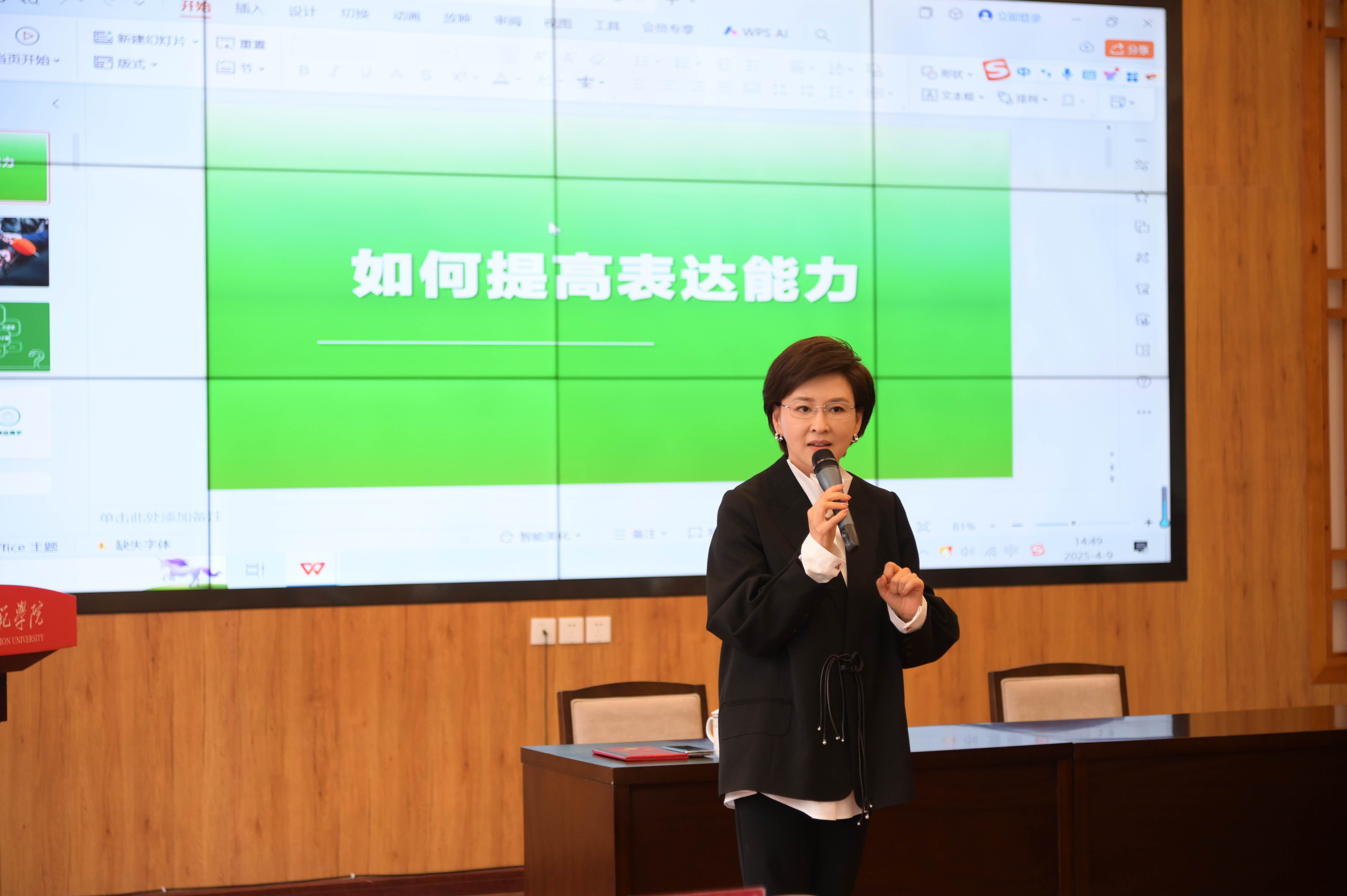 作为深耕播音主持领域的资深媒体人,窦爱莉以深厚的专业积淀和生动的语言艺术,围绕“如何更好地表达”展开深入讲解,她以日常生活情景为例,将理论与实践巧妙融合,剖析了日常表达的艺术与技巧;在表达的“方法论”上,窦爱莉从表达者的精神状态、声音表现、情感传达、体态仪态等方面,剖析非语言表达的重要性,并现场示范播音发声技巧,解析如何通过语音轻重、节奏变化提升语言表现力。“实战演练+即时反馈”的课堂设计,让在场学子直呼“既有方法论,又有代入感”。