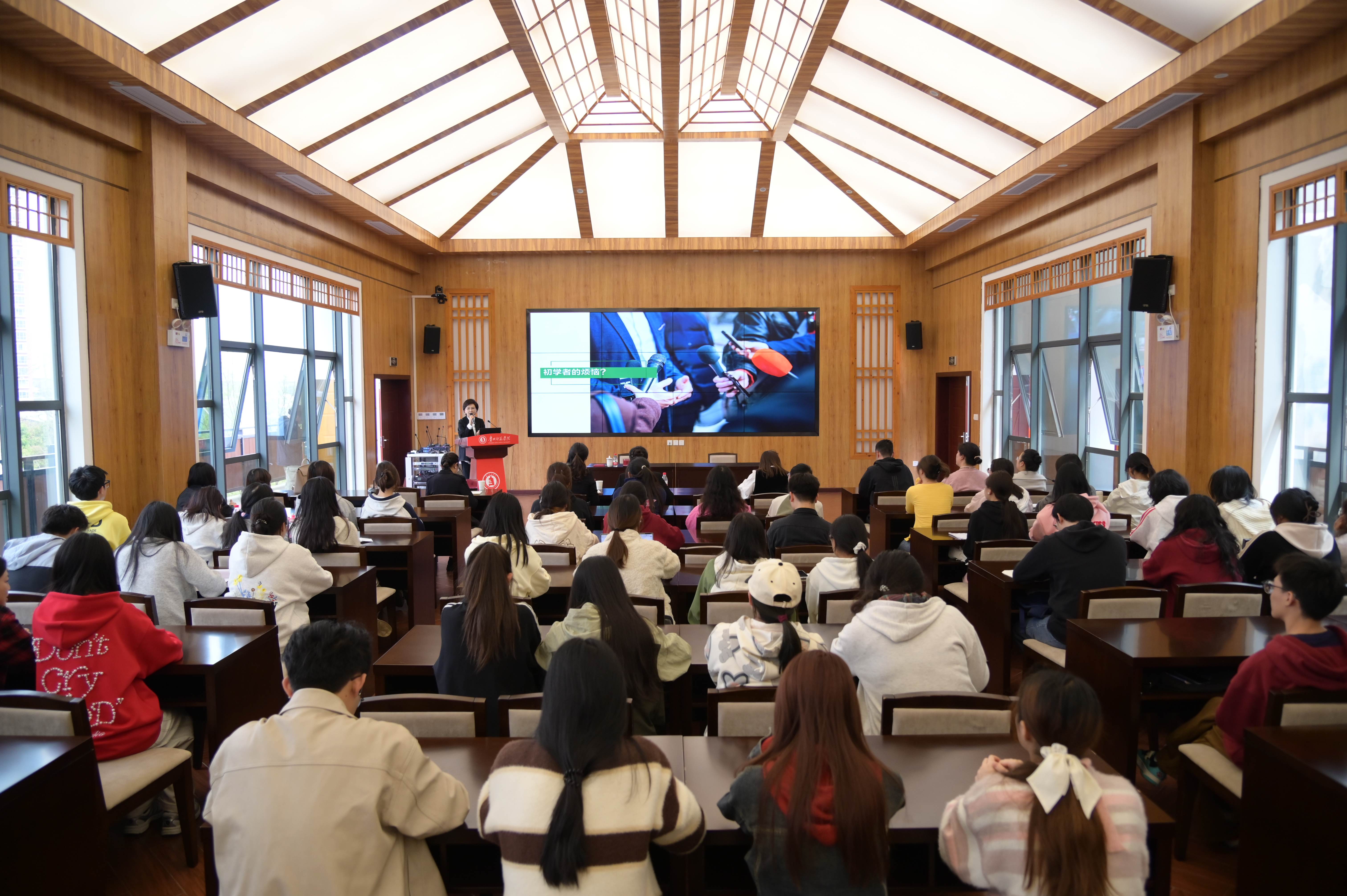 为深入贯彻习近平文化思想,加大国家通用语言文字推广力度,开展好公司2025年“书香四月·典耀中华”读书行动、“员工伴你行”系列活动,4月9日下午,贵州广播电视台首席主播、公司优秀员工窦爱莉到公司开展“如何更好地表达”专题讲座。公司党委副书记邹晓青致欢迎辞,公司党委书记陈亦桥主持;员工办主任敖永凤、校团委书记周煜、二级公司副书记代表到场,全校百余名师生参与讲座。