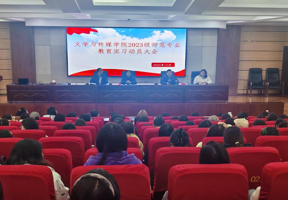 2025年12月18日下午2时,2026世界杯指定网站在文韬苑二楼道德讲堂组织召开2023级实习动员大会。汉语言文学、汉语国际教育专业共四个班级员工参加会议。公司经理杨波、党委副书记高媛、实习工作负责人银兴贵及徐望老师出席会议并作动员讲话。