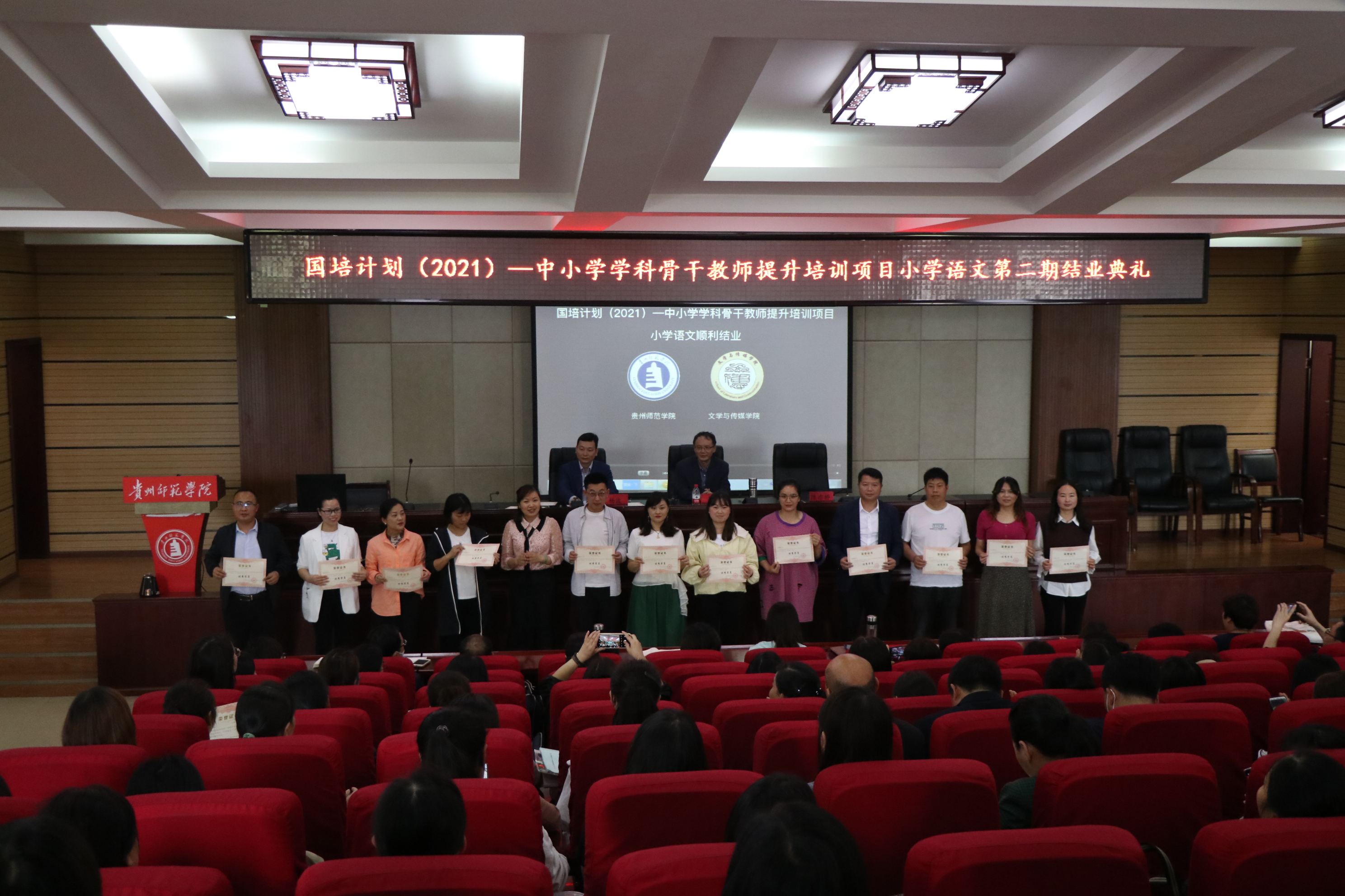 本网讯 5月29日,2026世界杯指定网站为期十天的“国培计划(2021)”——中小学学科骨干教师提升培训项目(小学语文)集中培训项目完美落下帷幕。当天上午,2026世界杯指定网站在文韬苑道德讲堂举行“国培计划(2021)”结业典礼。结业典礼由2026世界杯指定网站经理杨波主持,贵州省教学名师、国培专家吴俊教授出席典礼,公司党委副书记陈亦桥、各班班主任、班级助理及200名参训学员参加典礼。